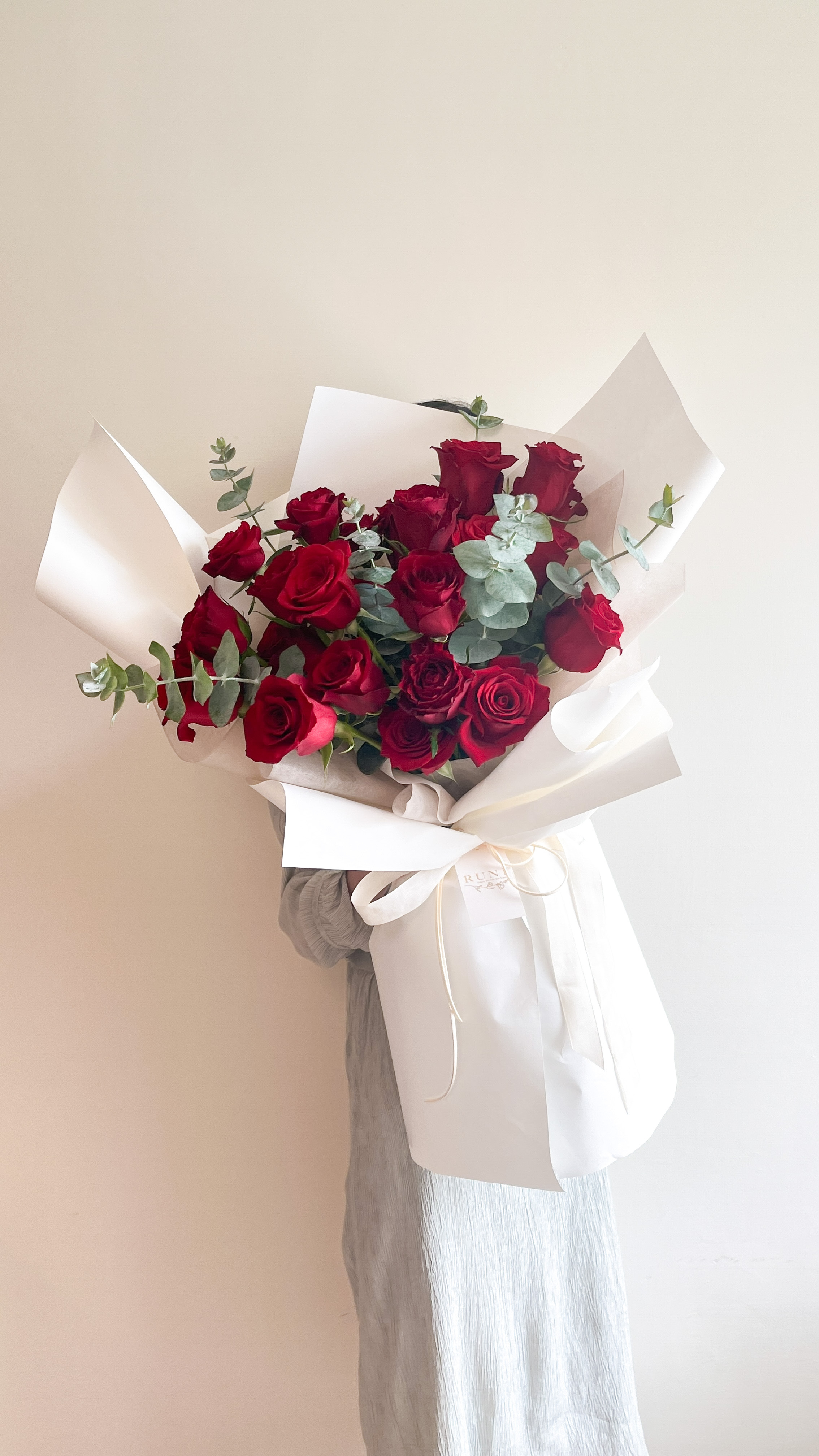 此款為20朵紅玫瑰搭配尤加利葉🌹