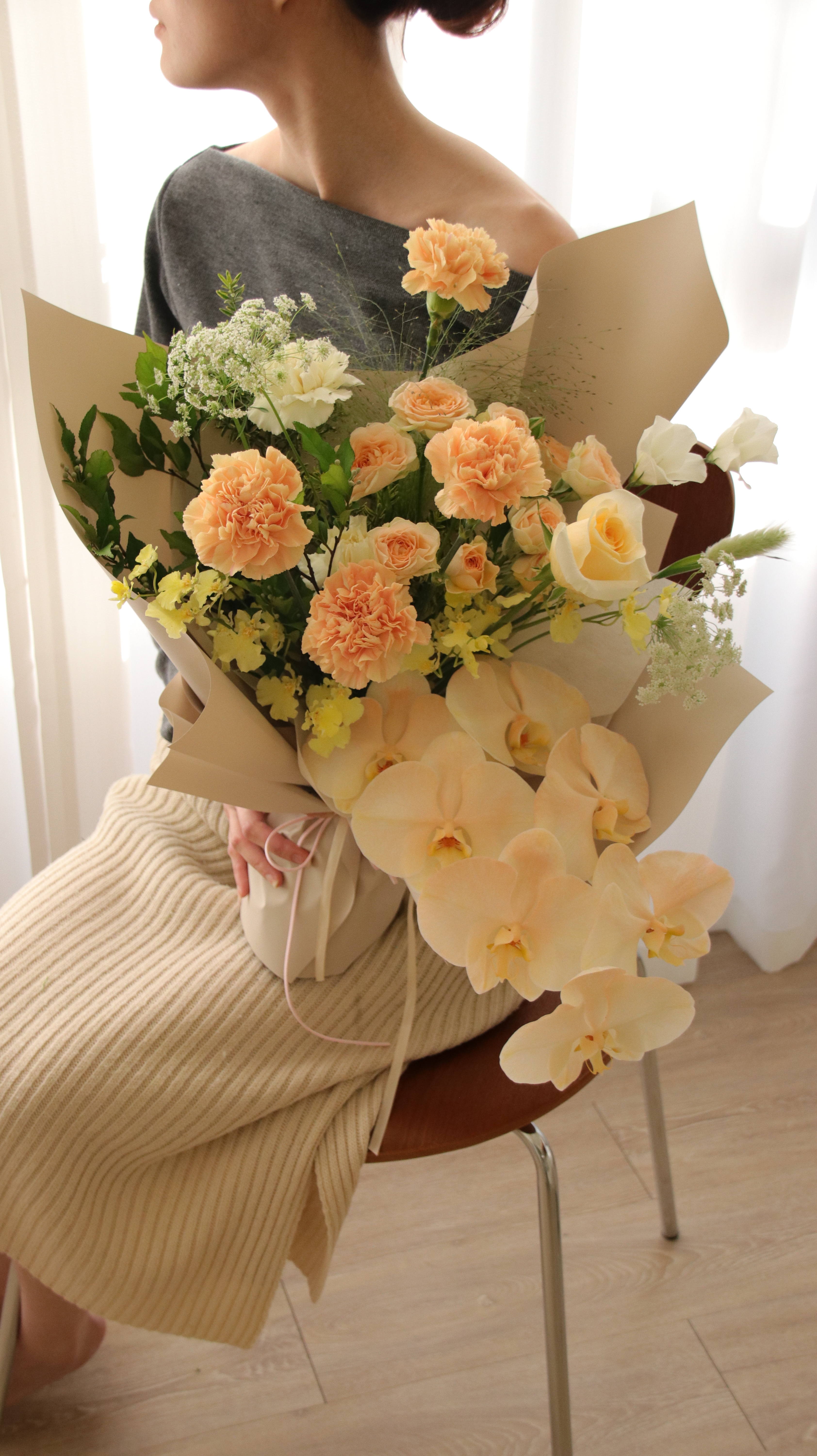 這束花,以康乃馨的溫柔與蘭花的優雅交織,獻給您那無聲卻堅定的力量。